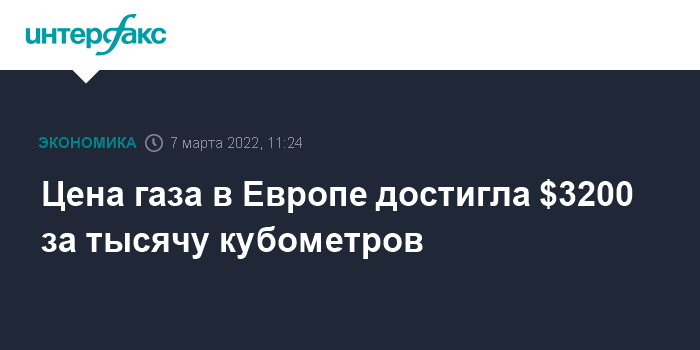 Москва. 7 марта. INTERFAX.RU - Спотовая цена газа в Европе утром в понедельник обновила исторический рекорд, взяв планку в $3200 за тысячу кубометров.
