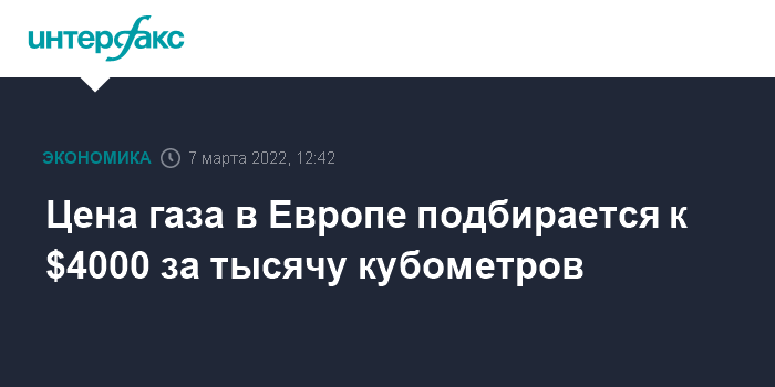 Москва. 7 марта. INTERFAX.RU - Спотовая цена газа в Европе утром в понедельник многократно обновила исторические рекорды, взяв курс на $4000 за тысячу кубометров.