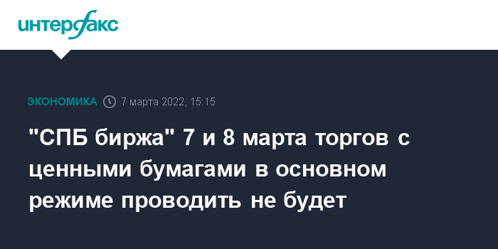 Москва. 7 марта. INTERFAX.RU - "СПБ биржа" 7 и 8 марта торги ценными бумагами в режиме основных торгов проводить не будет, сообщается в пресс-релизе биржи.