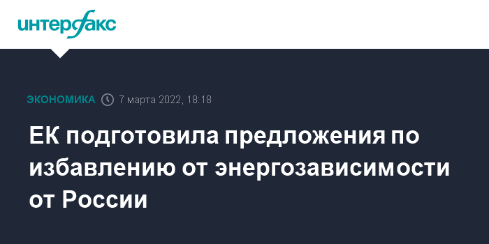 Москва. 7 марта. INTERFAX.RU - Председатель Еврокомиссии (ЕК) Урсула фон дер Ляйен объявила, что ЕК выдвинет во вторник предложения о том, каким образом покончить с зависимостью ЕС от российских энергетических источников.