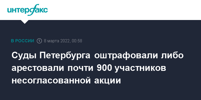 Москва. 8 марта. INTERFAX.RU - Почти 900 человек привлечены к административной ответственности в Петербурге за участие в несогласованном с властями антивоенном митинге 6 марта, сообщает объединенная пресс-служба судов города.
