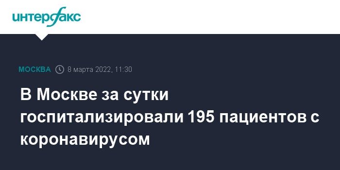 Москва. 8 марта. INTERFAX.RU - За последние сутки в Москве с COVID-19 госпитализированы 195 человек, сообщает столичный оперативный штаб по контролю и мониторингу ситуации с коронавирусом.