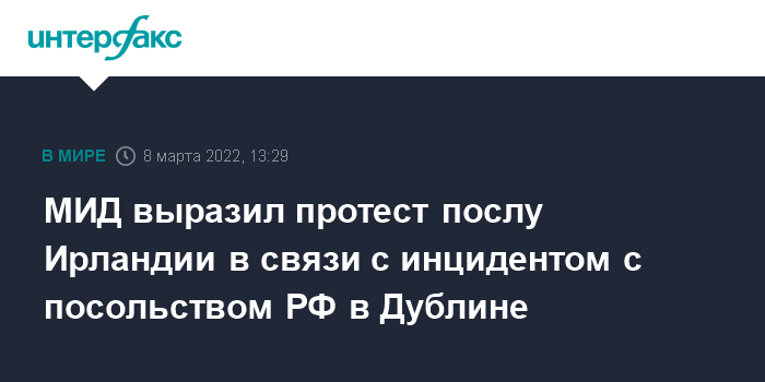 В МИД России "заявили о необходимости безотлагательного принятия ирландским правительством исчерпывающих мер в целях исключения угроз безопасности Посольству России в Дублине и его персоналу в соответствии с Венской конвенцией о дипломатических сношениях 1961 года."