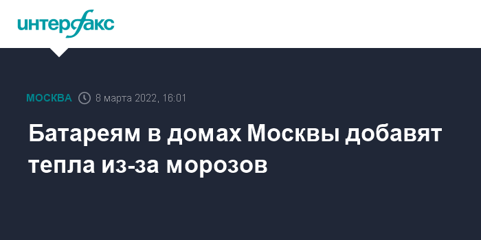 Москва. 8 марта. INTERFAX.RU - Коммунальные службы Москвы скорректируют температуру теплоносителя в сетях из-за ожидающегося похолодания, сообщается в телеграм-канале комплекса городского хозяйства во вторник.