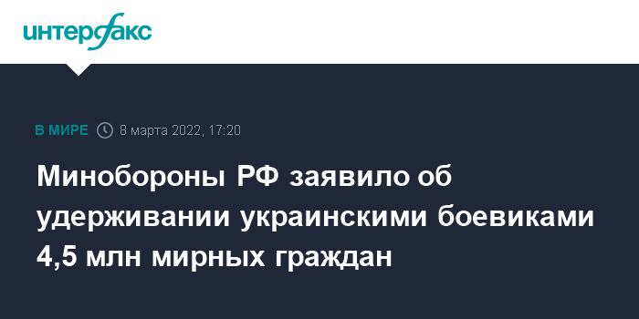 Москва. 8 марта. INTERFAX.RU - Начальник Национального центра управления обороной РФ Михаил Мизинцев заявил, что на Украине силами территориальной обороны насильно удерживаются более 4,5 млн граждан страны, а также примерно 2 тыс. иностранцев.