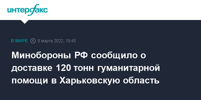 Минобороны РФ сообщило о доставке 120 тонн гуманитарной помощи в Харьковскую область
