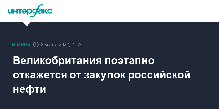 Москва. 8 марта. INTERFAX.RU - Власти Великобритании заявили о намерении постепенно отказаться от закупок российской нефти, говорится в коммюнике, опубликованном во вторник на сайте британского правительства.