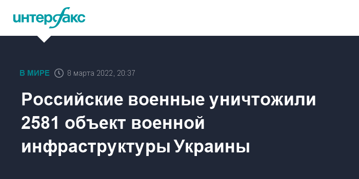 Москва. 8 марта. INTERFAX.RU - Минобороны РФ заявило, что всего за время операции уничтожено более 2,5 тыс. объектов военной инфраструктуры Украины.