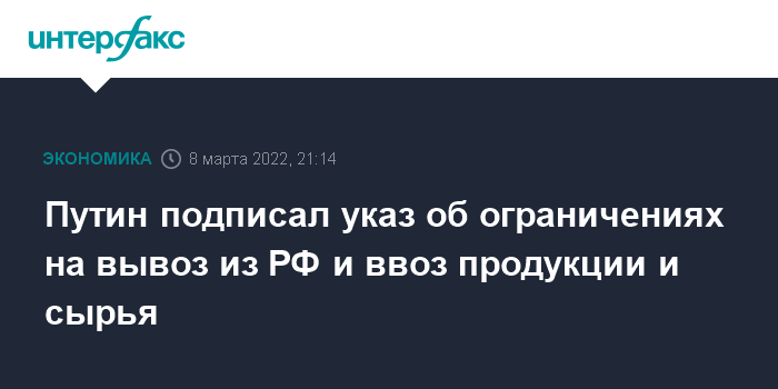 Путин подписал указ об ограничениях на вывоз из РФ и ввоз продукции и сырья