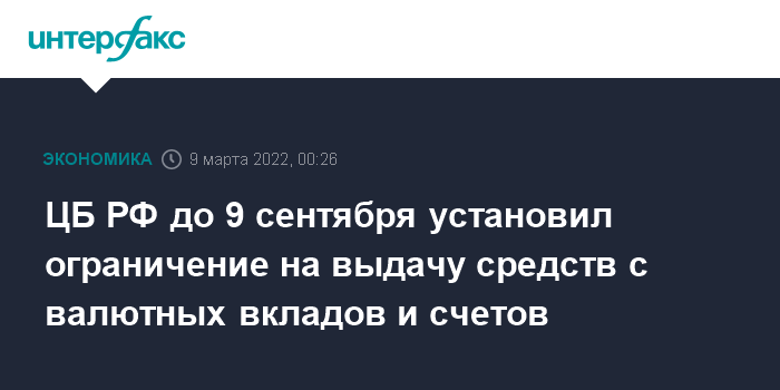 ЦБ РФ до 9 сентября установил ограничение на выдачу средств с валютных вкладов и счетов
