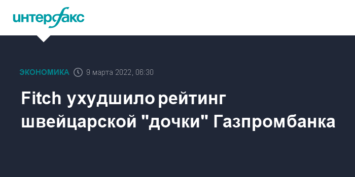 При этом Fitch отозвало рейтинг поддержки Gazprombank Switzerland, который составлял "2", и присвоило вместо него рейтинг поддержки со стороны акционера (SSR) на уровне "b-" (на пересмотре с возможностью снижения).
