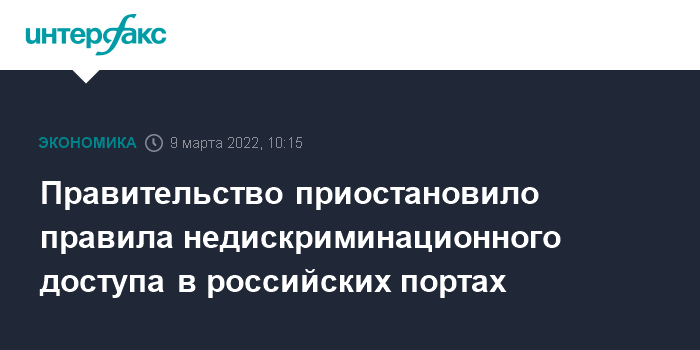 Москва. 7 марта. INTERFAX.RU - Правительство РФ до 1 июля 2022 года приостановило действие постановления от 20 октября 2017 года №1285 "Об утверждении правил недискриминационного доступа к услугам субъектов естественных монополий в морских портах".