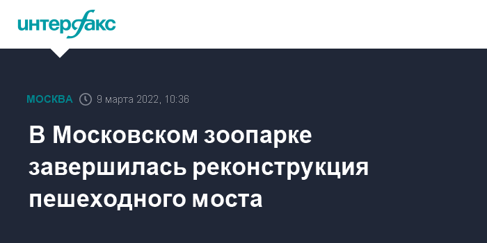 Москва. 9 марта. INTERFAX.RU - В Московском зоопарке завершили реконструкцию пешеходного моста и обустройство входа со стороны станции метро "Баррикадная", сообщила пресс-служба столичного градостроительного комплекса.