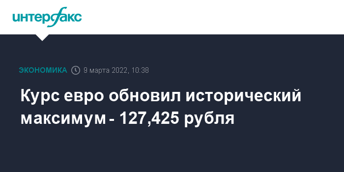 Москва. 9 марта. INTERFAX.RU - На "Московской бирже" курс евро утром 9 марта обновил исторический максимум и уперся в установленную биржей новую верхнюю границу - 127,425 рубля; доллар при этом торговался вблизи отметки 117,355 рубля.