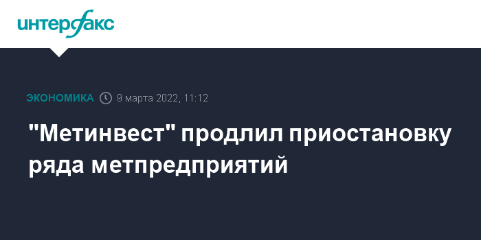 Москва. 9 марта. INTERFAX.RU - Украинская горно-металлургическая группа "Метинвест" сообщила, что продлила режим консервации на металлургических предприятиях, горно-обогатительные комбинаты продолжают работу.