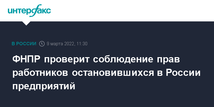 Москва. 9 марта. INTERFAX.RU - Федерация независимых профсоюзов России (ФНПР) будет следить за ситуацией с соблюдением трудовых прав сотрудников компаний, руководство которых приняло решение приостановить работу в России, сообщил "Интерфаксу" заместитель председателя ФНПР Александр Шершуков.