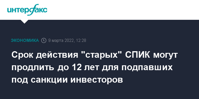 Москва. 9 марта. INTERFAX.RU - Власти планируют продлить до 12 с 10 лет срок действия специнвестконтрактов (СПИК 1.0), заключенных в "старой" версии, для подпавших под действие санкции компаний. Также планируется вновь разрешить заключать СПИК 1.0.