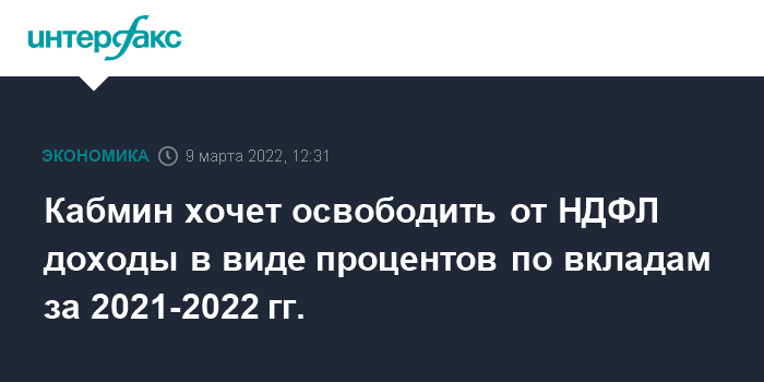 Москва. 9 марта. INTERFAX.RU - Правительство РФ на заседании 9 марта рассмотрит проект поправок в Налоговый кодекс, которым, в частности, предлагается освободить от НДФЛ доходы физлиц в виде процентов, полученных в 2021 и 2022 годах по вкладам (остаткам на счетах) в банках, сообщил источник "Интерфакса", знакомый с материалами к заседанию кабмина.