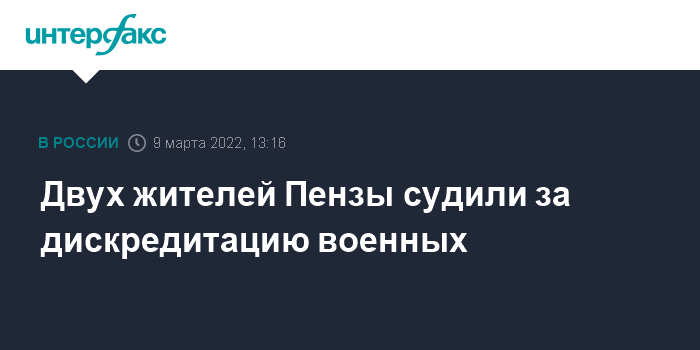 Москва. 9 марта. INTERFAX.RU - Суды в Пензе признали двух местных жителей виновными в дискредитации Вооруженных сил России, сообщает пресс-служба областного управления МВД.