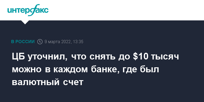 В ночь на 9 марта ЦБ запретил покупку наличной валюты и ограничил ее выдачу с действующих вкладов суммой $10 тысяч сроком на полгода - с 9 марта по 9 сентября 2022 года, объяснив эти решения введенными против России санкциями. В этот период клиенты банков могут снять с открытого до 9 марта счета до $10 тысяч в наличной валюте, а остальные средства - в рублях по рыночному курсу на день выдачи.
