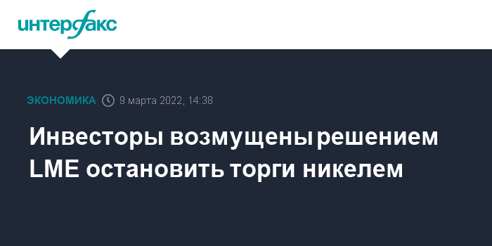 Москва. 9 марта. INTERFAX.RU - Трейдеры и инвесторы возмущены решением Лондонской биржи металлов (LME) приостановить торги никелем и отменить ряд уже совершенных сделок с металлом.