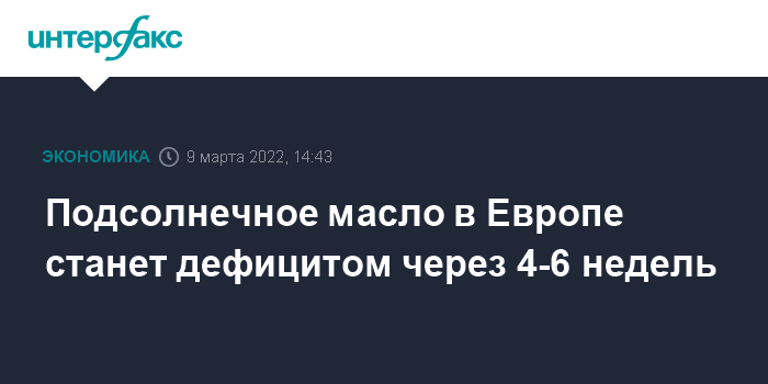 Москва. 9 марта. INTERFAX.RU - Страны Евросоюза через 4-6 недель столкнутся с дефицитом нерафинированного подсолнечного масла, вызванного вынужденной остановкой его экспорта с Украины, что в свою очередь вызовет дефицит рафинированного и бутилированного масла для европейских домохозяйств.