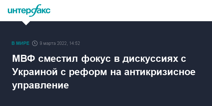 Москва. 9 марта. INTERFAX.RU - Международный валютный фонд (МВФ) сместил фокус в дискуссиях с властями Украины с реформ на антикризисное управление. Об этом сообщила исполнительный директор МВФ Кристалина Георгиева в ходе FT Climate Capital Conference.
