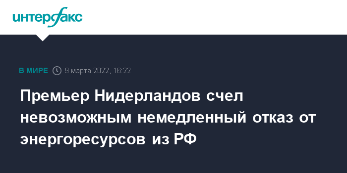 Москва. 9 марта. INTERFAX.RU - Премьер-министр Нидерландов Марк Рютте заявил, что не поддерживает идею незамедлительно отказаться от импорта российских нефти и газа, поскольку это нерационально для стран Европейского союза.