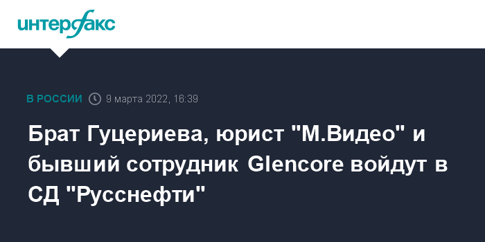 Москва. 9 марта. INTERFAX.RU - Представители трейдера Glencore не вошли в список кандидатов в совет директоров "Русснефти", их заменят совладелец нефтекомпании Саит-Салам Гуцериев (брат Михаила Гуцериева), юрист группы "М.Видео-Эльдорадо" (ПАО "М.Видео") Алексей Сухов и бывший сотрудник трейдера, ныне совладелец ООО "Альянс Индастри Групп" Владимир Щербак, следует из материалов компании.