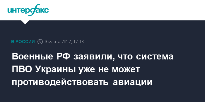 Москва. 9 марта. INTERFAX.RU - Система ПВО Украины носит только очаговый характер и не способна оказывать существенного противодействия российской авиации, сообщили в Минобороны РФ.