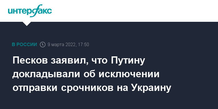 "До начала проведения специальной военной операции по указанию президента России, Верховного главнокомандующего Владимира Путина до всех командиров подразделений Вооруженных сил было доведено указание: категорически исключить привлечение военнослужащих срочной службы для выполнения любых задач на территории Украины. Президенту Путину было доложено о выполнении этого указания", - сказал Песков журналистам в среду.