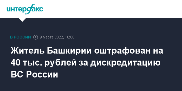 Житель Башкирии оштрафован на 40 тыс. рублей за дискредитацию ВС России