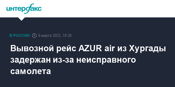 Москва. 9 марта. INTERFAX.RU - Вылет самолета AZUR air, прилетевшего в египетскую Хургаду за российскими туристами, задержан уже на пячть часов из-за технической неисправности, 342 пассажира ждут резервного борта, сообщила Ассоциация туроператоров России (АТОР).