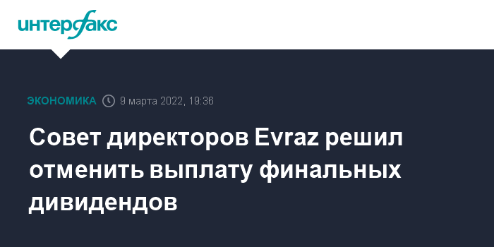 Москва. 9 марта. INTERFAX.RU - Совет директоров Evraz принял решение отменить выплату (объявлена 25 февраля, сама выплата назначена на 30 марта) финальных дивидендов в размере $0,5 на акцию (общая сумма - $729 млн).