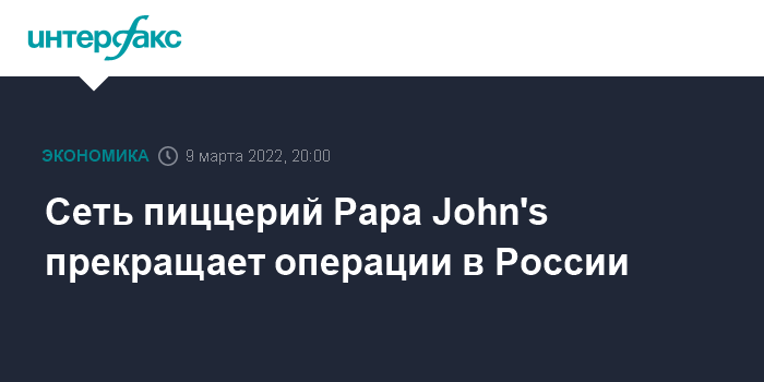 Москва. 9 марта. INTERFAX.RU - Американская сеть пиццерий Papa John's International Inc объявила о прекращении всех корпоративных операций в России.