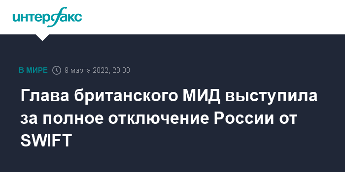 Москва. 9 марта. INTERFAX.RU - Россию следует полностью отключить от системы SWIFT, а странам G7 надо отказаться от российской нефти и газа, считает глава британского МИД Лиз Трасс.