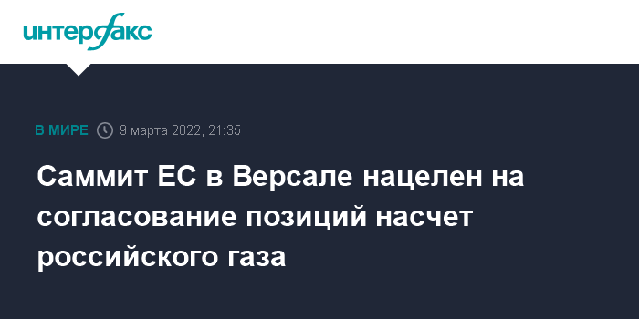 Москва. 9 марта. INTERFAX.RU - Обсуждение энергетики ЕС с целью постепенного сокращения зависимости от российского импорта газа, нефти и угля будет принципиальным вопросом саммита ЕС в Версале 10-11 марта, сообщил высокопоставленный европейский чиновник.