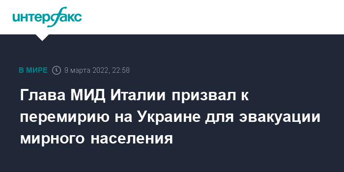 Москва. 9 марта. INTERFAX.RU - Италия призывает к согласованию на Украине перемирия продолжительностью в два-три дня для эвакуации мирных жителей, заявил глава итальянского МИД Луиджи Ди Майо.