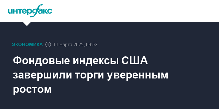 Москва. 10 марта. INTERFAX.RU - Американские фондовые индексы завершили торги в среду уверенным подъемом после падения по итогам предыдущих четырех сессий.