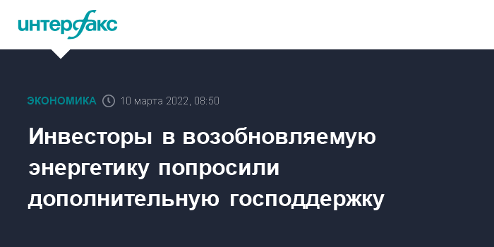 Москва. 10 марта. INTERFAX.RU - Российские инвесторы в возобновляемую энергетику (ВИЭ) считают необходимым пересмотр "ряда параметров" поддержки отрасли, а пока просят продлить срок нештрафуемого опоздания со вводами объектов.