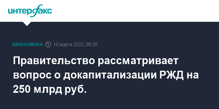 Москва. 10 марта. INTERFAX.RU - ОАО "РЖД" может быть докапитализировано на 250 млрд руб в рамках плана правительства по поддержке экономики в условиях санкций, сообщает в четверг газета "Ведомости" со ссылкой на имеющийся у нее документ.