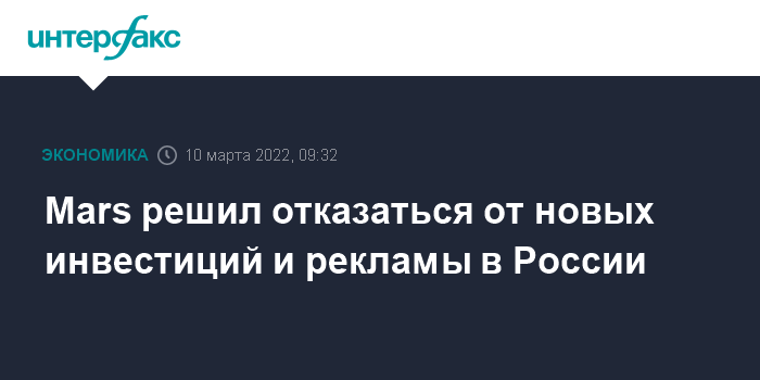 Москва. 10 марта. INTERFAX.RU -Американский производитель продуктов питания и кормов для домашних животных Mars Inc. прекращает новые инвестиции в России, а также свернет здесь и в Белоруссии рекламную деятельность. Об этом говорится в заявлении CEO Mars Гранта Рида.