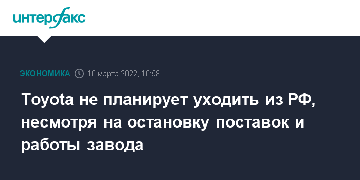 Москва. 10 марта. INTERFAX.RU - Японский автоконцерн Toyota Motor приостановил производство и поставки в РФ, но пока не планирует покидать российский рынок, сообщили "Интерфаксу" в пресс-службе компании.