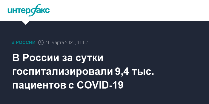 Москва. 10 марта. INTERFAX.RU - В России с коронавирусом госпитализирован еще 9 401 человек, следует из данных оперативного штаба, обнародованных в четверг.