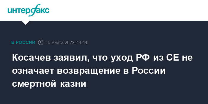 Москва. 10 марта. INTERFAX.RU - Выход России из Совета Европы не будет означать возвращение в законодательство РФ смертной казни, заявил вице-спикер Совета Федерации Константин Косачев.