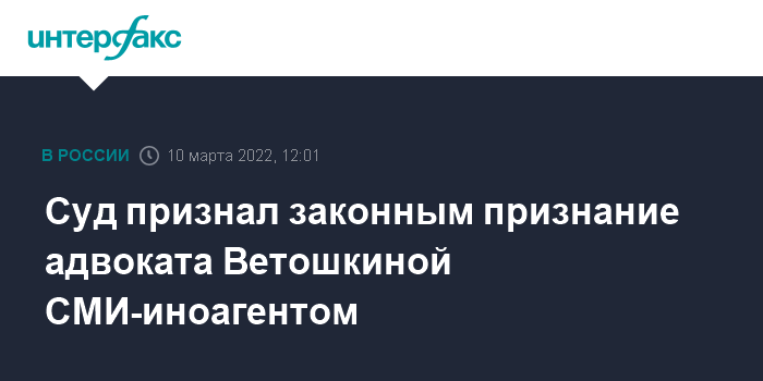 Москва. 10 марта. INTERFAX.RU - Замоскворецкий суд отклонил административный иск адвоката правозащитного проекта "Первый отдел" Валерии Ветошкиной (признана властями СМИ-иноагентом), которая просила признать незаконным решение Минюста присвоить ей этот статус. Об этом "Интерфаксу" сообщили в пресс-службе суда.