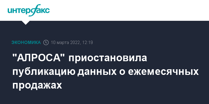"В связи с текущими событиями "АЛРОСА" вынуждена адаптироваться к меняющимся условиям работы и приостанавливает публикацию ежемесячных данных о продажах до отдельного уведомления", - сообщил представитель компании.