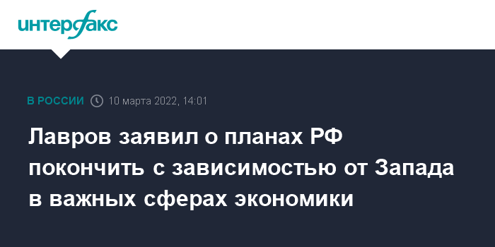 Москва. 10 марта. INTERFAX.RU - Россия намерена отказаться от зависимости от Запада в сферах, имеющих определяющее значение для граждан страны, преодолеет вызванные западными санкциями проблемы в экономике, заявил глава МИД РФ Сергей Лавров.