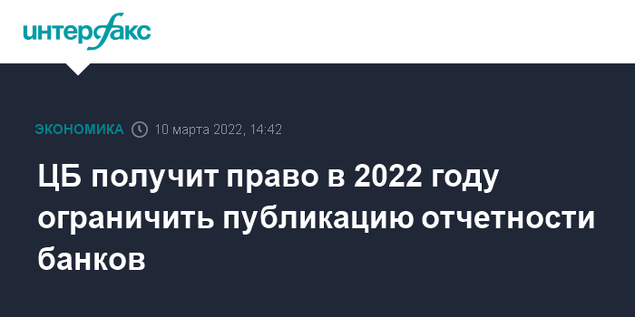 ЦБ РФ 6 марта "для ограничения санкционных рисков" разрешил банкам временно сократить объем раскрытия отчетности, публикуемой на их сайтах, а также на сайте регулятора. Начиная с отчетности за февраль 2022 года банки не обязаны публиковать бухгалтерскую отчетность (индивидуальную и консолидированную) по российским стандартам, а также дополнительные раскрытия к ней.