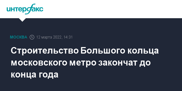 Москва. 12 марта. INTERFAX.RU - До конца 2022 года в столице завершатся работы по строительству Большой кольцевой линии московского метрополитена и ее подготовка к запуску, сообщил заммэра Москвы по вопросам градостроительной политики и строительства Андрей Бочкарев.